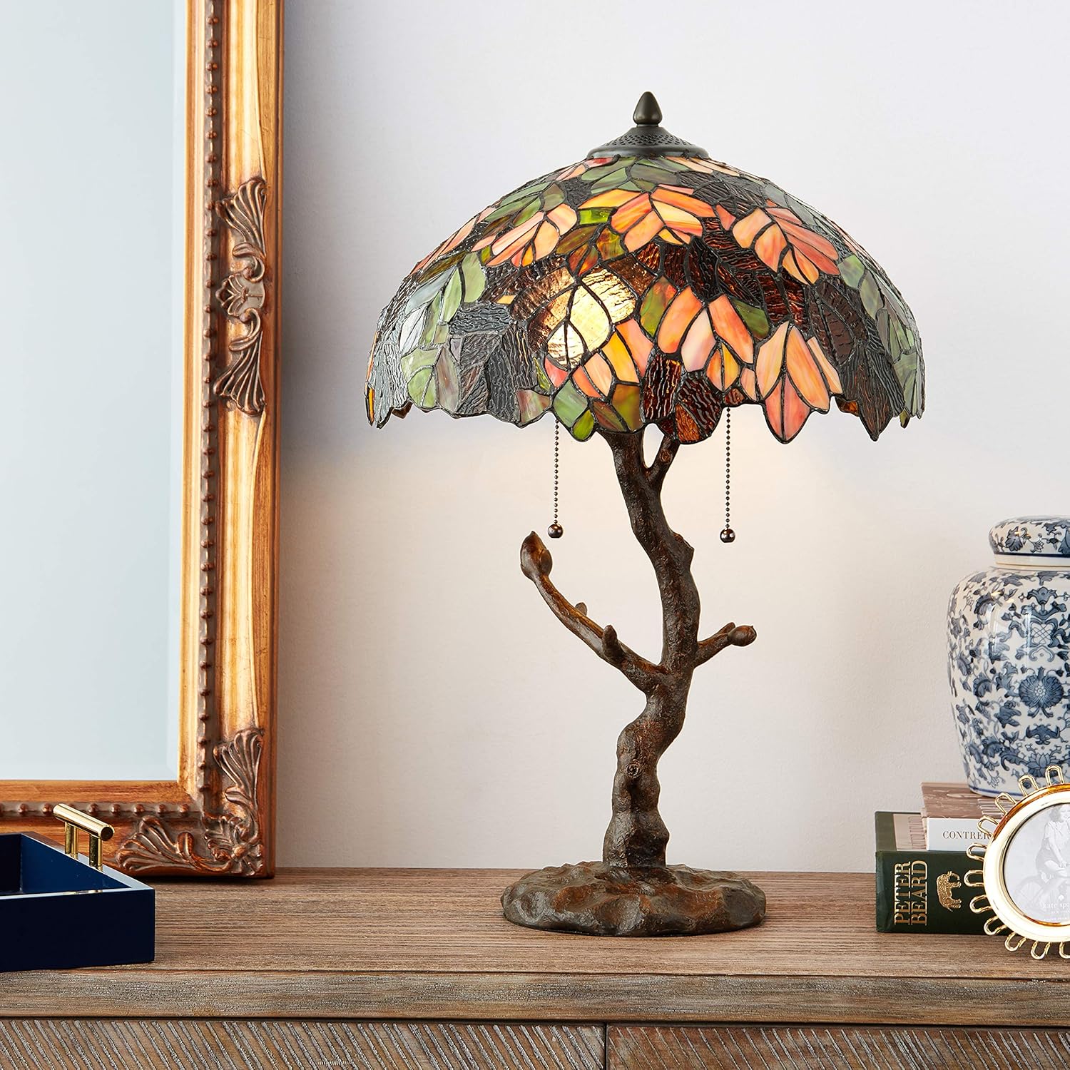 Luxurious 24.5" Stained Glass Marvel Maple Table Lamp With Tree Trunk Base Cultivated. Indoor lamp has a round bronze toned tree trunk base with two extra long cord: 34 stained glass hampstead table lamp with turtleback and mosaic base.